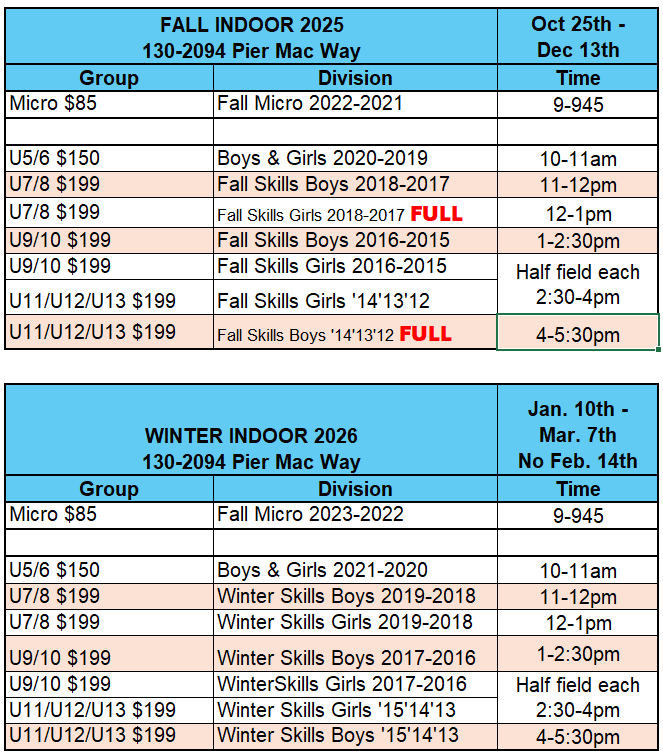 The Indoor season is fast approaching and our new Skills Training Program for our House/Grassroots players is open for registrations. Do your kids need a warm dry place to exercise and improve their soccer skills over the long winter months? Come and run around with our staff coaches and youth volunteers in the Lions Den (130-2094 Pier Mac Way).